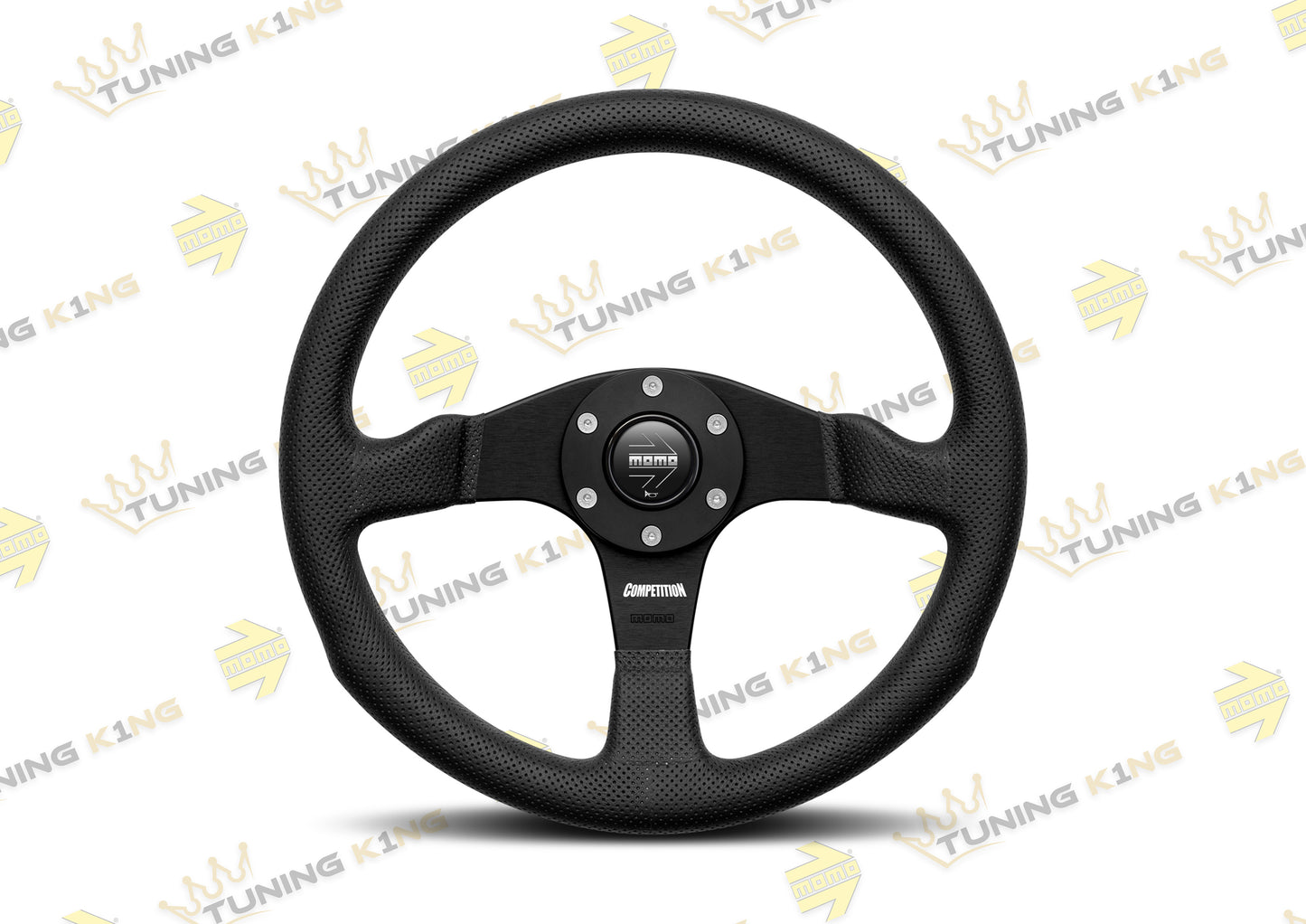 Das MOMO Sportlenkrad Competition aus schwarzem gelochten Leder mit großem Griff. Schwarze Speichen mit flachem Ring.